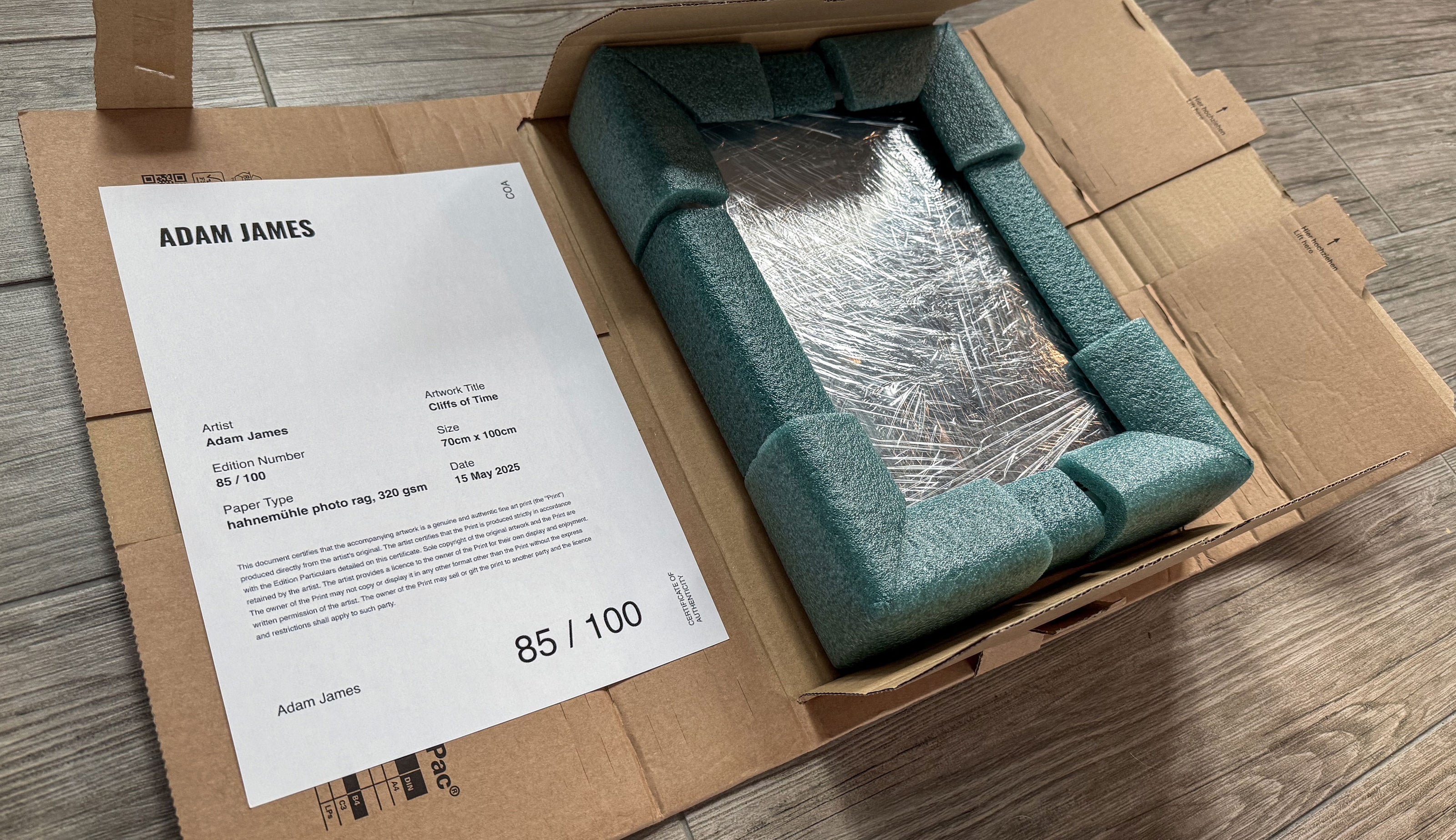 Every artwork is printed on Hahnemühle Photorag 308GSM — The paper gives muted blacks with even colour reproduction, and excellent detail. The surface has minimal texture with a chalky smooth cotton feel which creates smooth colour gradients.